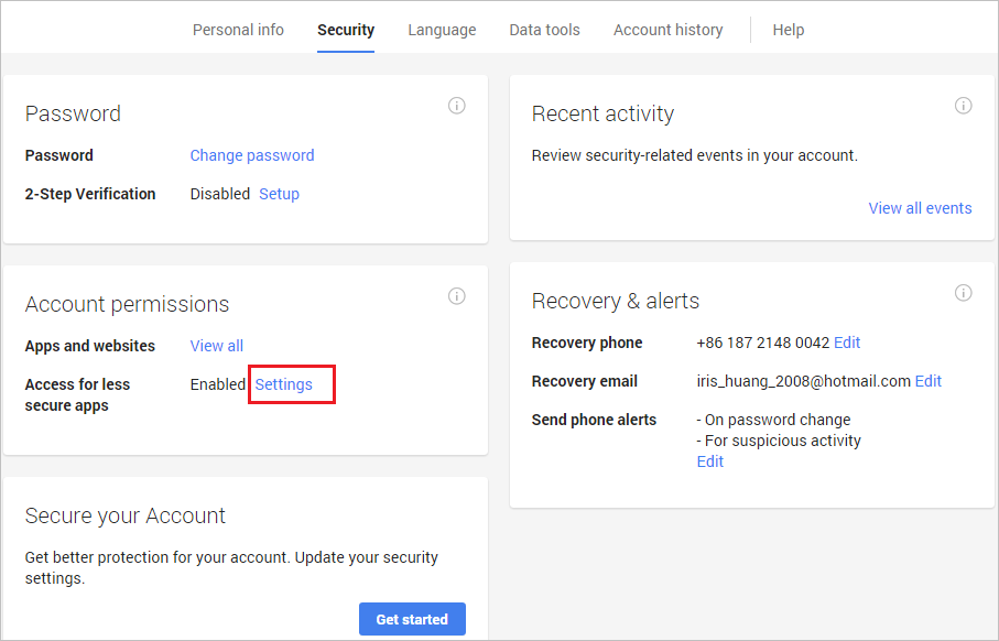 2. Click on “Settings” behind“Access for less secure apps”, then choose “Enable”.