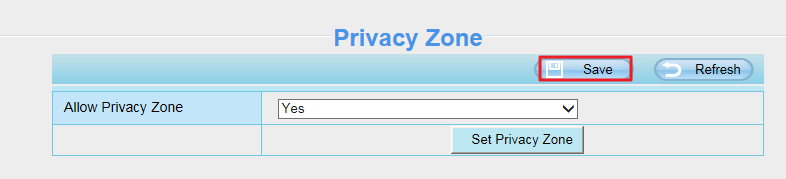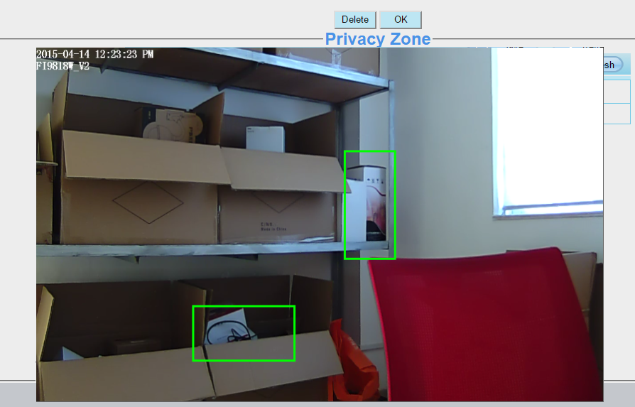 Click Set Privacy Zone button, a living video window will pop up for you. Please left click your mouse and hold to drag a zone. Multiple zones can be set, you may like to drag more zones. Then click OK and remember to click Save.