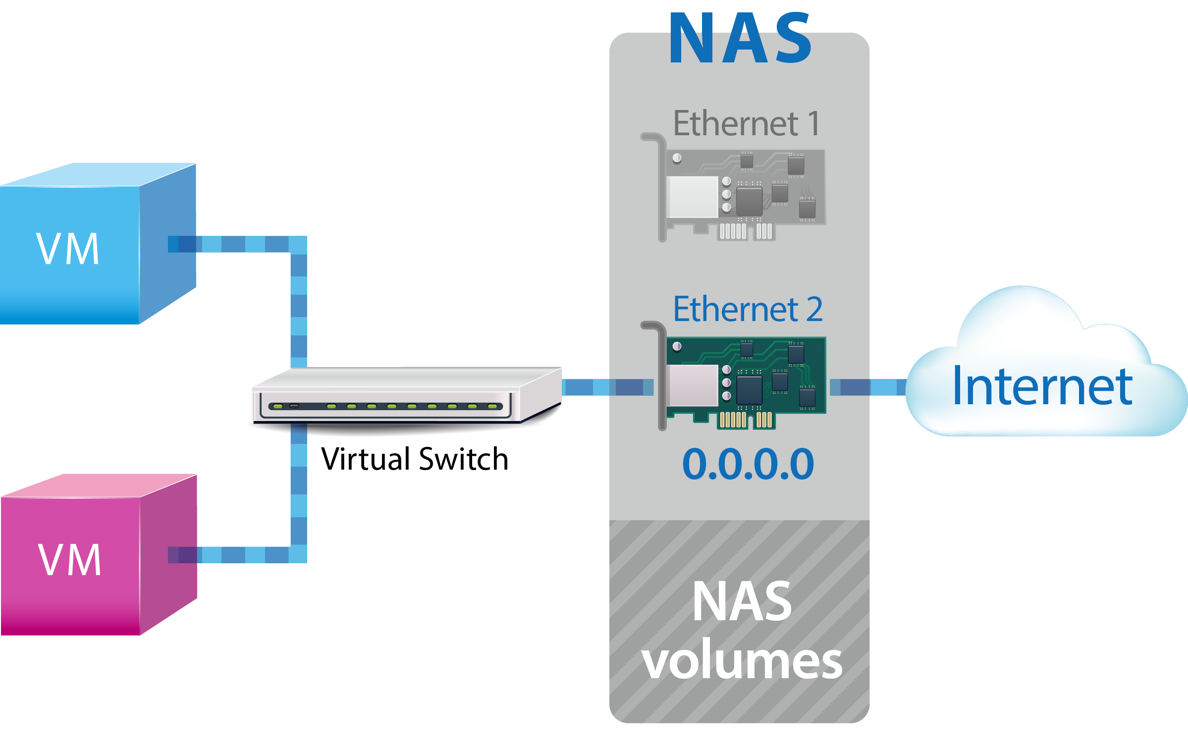 After attaching an Ethernet interface to a Virtual Switch, the IP address of the interface will be changed to 0.0.0.0 and the interface then will be dedicated to the Virtual Switch. However, VMs connected to the Virtual Switch cannot access the NAS internally and instead use the outside gateway.