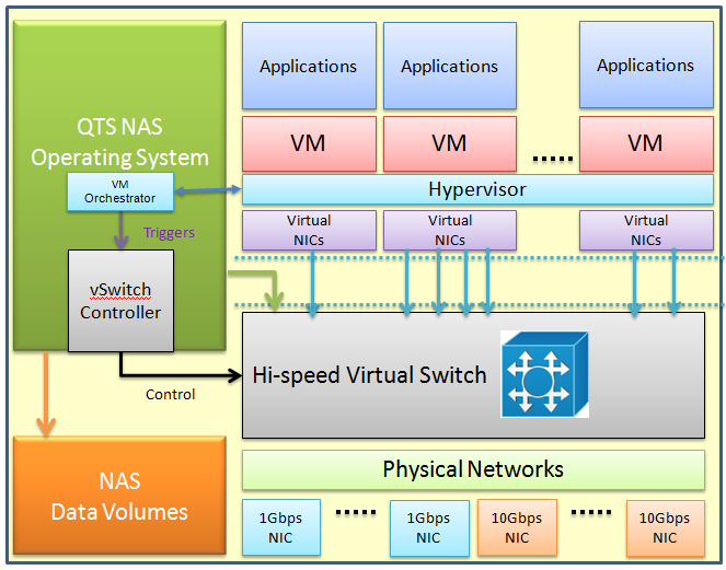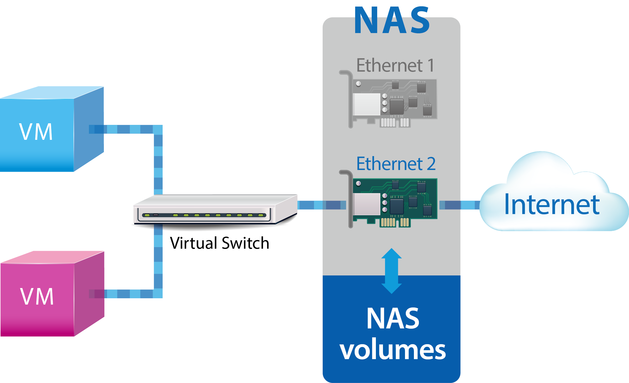Attaching an Ethernet interface (Port-trunking available) to a Virtual Switch creates a bridged network. The NAS and the Virtual Switch can share the same Ethernet interface without conflicts and it supports high-speed data transfer via internal routing.