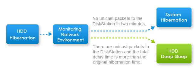 - If any unicast packets are received by your Synology NAS within two minutes, then your Synology NAS will remain in HDD Hibernation and continue monitoring network packets for another two minutes.