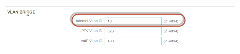 Enter 10 in the box beside Internet VLan ID.(Remark: For IPTV VLan ID and VOIP VLan ID, Please check with your Service provider.)