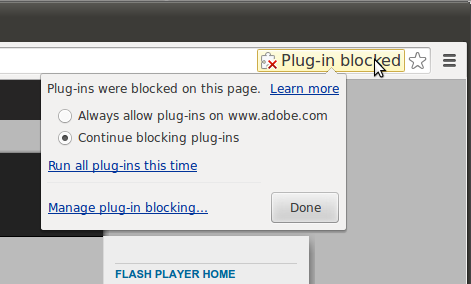 Users will still be able to allow NPAPI plugins for specific sites by clicking on the “Plug-in blocked” message in the URL bar and choosing “Always allow plug-ins on [website].” Here is how that looks: