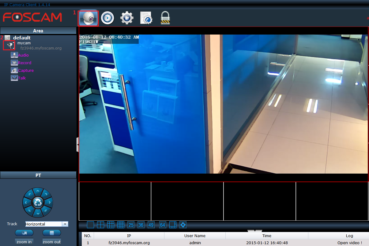 Go back to Live Video page. On the left Area window, please drop down the “default” area, you’ll find the camera just added. Click on the camera icon to connect, then you can view your camera video in WAN.