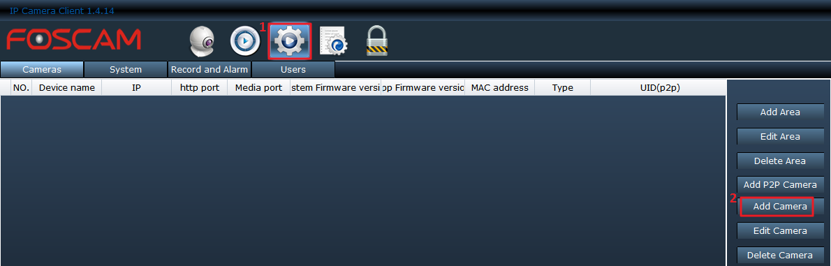 Launch Foscam Client software, go to System > Add Camera, click on Add Camera.